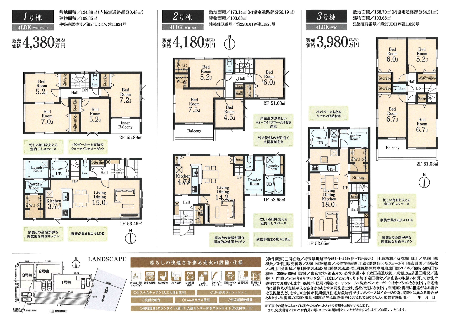 物件は全3棟の新築戸建てで、いずれも4LDKのゆとりある間取りを採用。広々としたリビングを中心に、家族が自然と集まり、心地よい時間を過ごせる空間設計となっています。